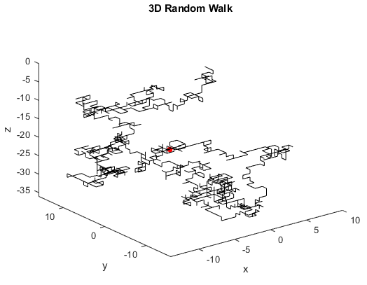 particle.m: A function that simulates a fluid in 1D with the ideal gas conditions. Initially has particles with velocities in Boltzmann distribution. Takes parameters N = Number of particles, r = Radius of each particle, m = Mass of each particle, and d = Initial spacing between particles. Parameters must constitute a low Reynold environment for best simulation.particleAnalysis.m: Simulates a number of 1D fluids, then plots the mean displacement and mean-squared-distance over time to show that they are constant at 0 and linear, respectively. Each simulation takes around 1.2 seconds to run, making 100 simulations take 2 minutes to run and 500 simulations 10 minutes to run.particleVisual.m: Shows an animation of a fluid in 1D, with one of the particles highlighted red to clearly show its behavior.walkND.m: A function that simulates an N-dimensional walk given the number of dimensions, the starting position, the number of steps, and the step size. Returns an array containing all the positions visited during the walk.walkNDanalysis.m: Runs 100 simulations of 1000 step random walks, then calculates the mean final displacement and the mean final squared displacement, and also plots the mean displacement and the mean squared displacement over the number of steps, showing that they are constant at 0 and linear, respectively.walk1Dvisual.m: Shows an animated graph of the position over step number.walk2Dvisual.m: Shows an animation of a point moving in a random walk in a 2D plane.walk3Dvisual.m: Shows an animation of a point moving in a random walk in a 3D space.